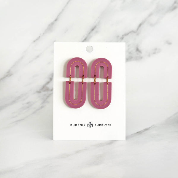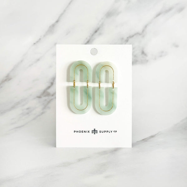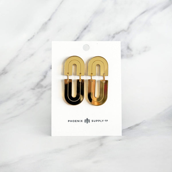 Make a statement with the Echo dangle earrings, a modern design that pairs bold arch shapes with hand-painted gold line details. Lightweight yet eye-catching, these earrings bring a sleek architectural vibe to any look. Available in four versatile colorways, they’re the perfect way to showcase your style with ease.